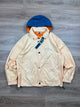 Tan Sandro Paris Faux Shearling cotton denim twill trucker jacket, slim fit in great condition no flaws.
